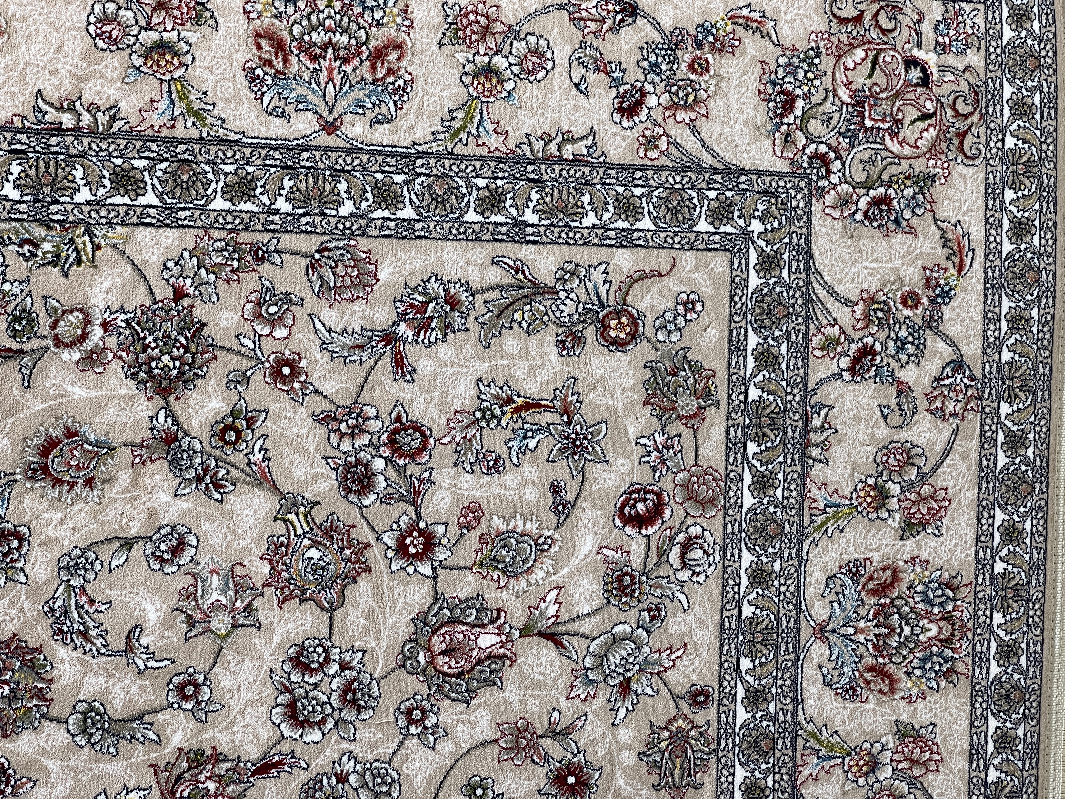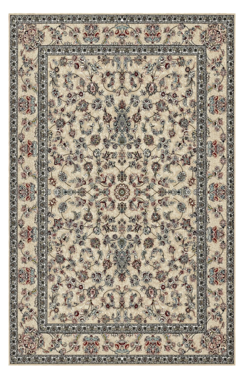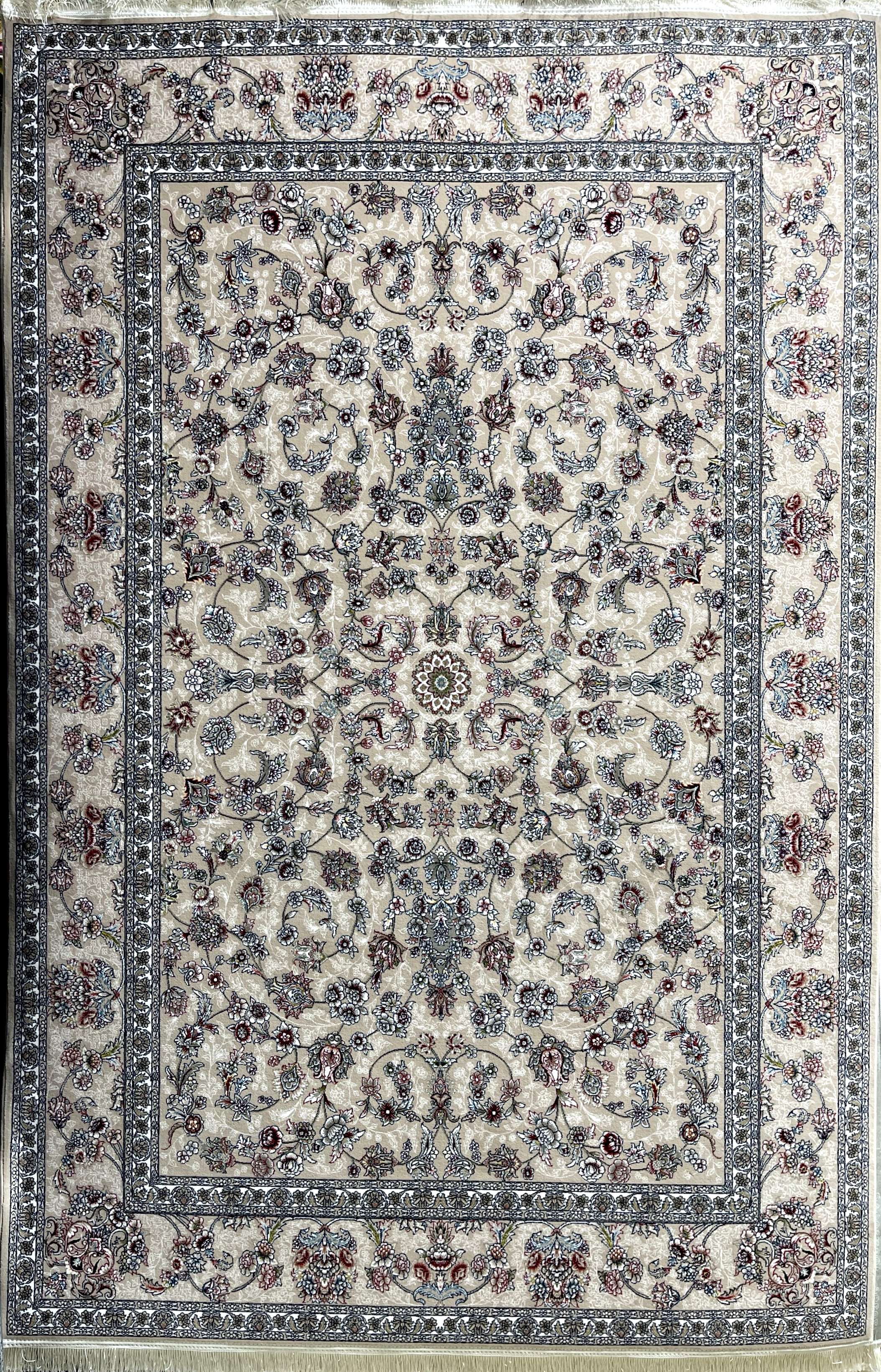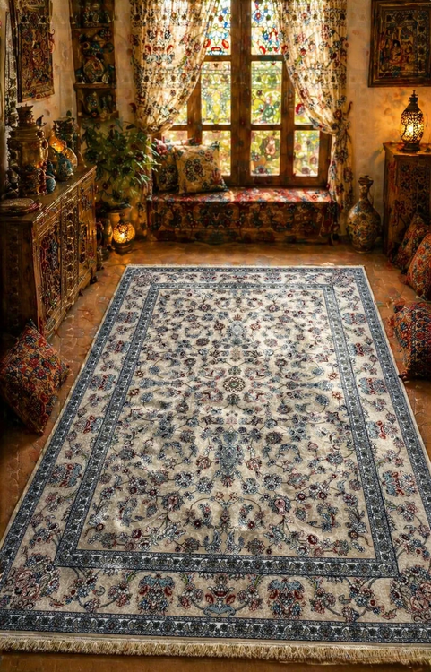 این فرش با طرحی اصیل و الهامگرفته از نقوش کلاسیک ایرانی، جلوهای ظریف و چشمنواز به فضای خانه میبخشد. زمینه روشن آن با ترکیبی از گلها و اسلیمیهای ظریف طراحی شده که در کنار حاشیههای پرکار، هماهنگی و زیبایی خاصی ایجاد کرده است. استفاده از طیف رنگی کرم، آبی و قرمز ملایم باعث شده این فرش بهراحتی با انواع دکوراسیونهای کلاسیک و مدرن هماهنگ شود.